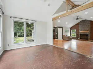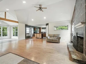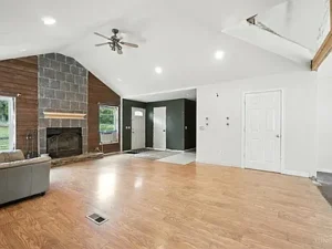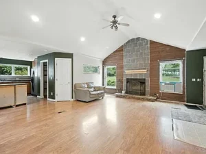 - Open floor plan with vaulted ceilings & fireplace