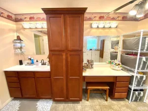 The main level includes a large living room with a brick fireplace (woodburner), bay window, and beautiful flooring. The roomy kitchen offers a walk-in pantry, bar seating, and another bay window for natural light. A dedicated laundry room with utility sink adds convenience. The family room is designed for entertaining, complete with a bar, exposed brick wall, and patio doors that open directly to the pool area. A guest bathroom nearby ensures easy access for gatherings. The primary suite features a huge bathroom with a stand-up shower, makeup vanity, linen storage, built-in ironing board, and both a walk-in closet plus double closets. Upstairs, you’ll find two comfortable bedrooms and a spacious landing area that works well as a bonus room.
