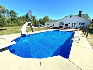 The private backyard is truly an oasis, boasting a 41×20 inground pool with diving board, water slide, new liner, hot tub, outdoor TV, firepit with seating, and a volleyball net. Patio furniture is included, creating a ready-to-enjoy entertainment space.