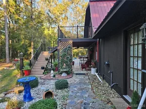 Upstairs, you’ll find a second kitchen, a large living area, and another bedroom with built-ins and a private bath. The layout offers great flexibility, with potential for a third bedroom or even a separate guest suite thanks to its private entry and balcony overlooking the backyard, wooded acreage, and in-ground pool.
