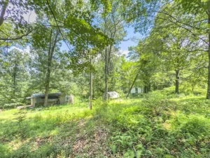 The land includes mature cherry, apple, pear, peach, and walnut trees, along with ample space for gardening. A covered front patio and a back deck provide peaceful spots to enjoy the ridge-top views. The forested acreage is dominated by white oak, chestnut oak, and red oak, creating excellent habitat for wildlife, with frequent sightings of deer and turkey.
