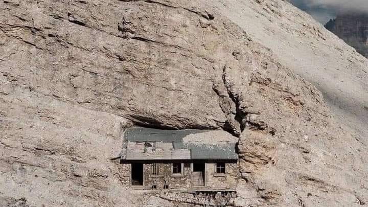 ️ WWI Mountain Shelter: Built by Italian Alpini soldiers during World War I into a cliff face in the Dolomites (2,760 m elevation), used for observation and protection.